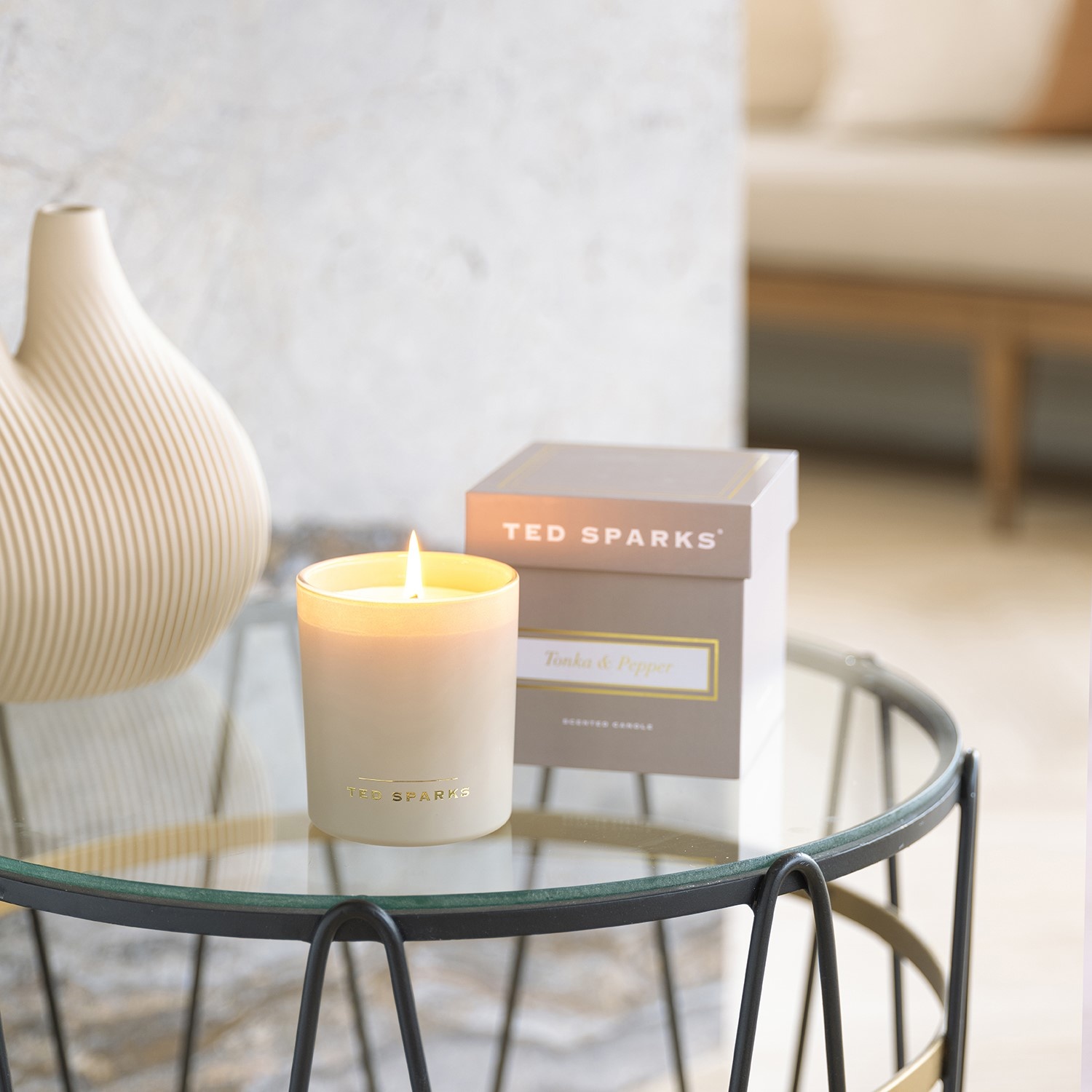 De Tonka & Pepper geur die vrijkomt bij het aansteken van de Ted Sparks geurkaars zorgt ervoor dat de ruimte zich vult met een warme ambiance waarin iedereen zich welkom en comfortabel voelt. Het is een verfijnde geur met een oriëntaals akkoord van cederhout, tonka en wierook. Gegarneerd met de frisheid van grapefruit, onderstreept door de kruidigheid van peper.